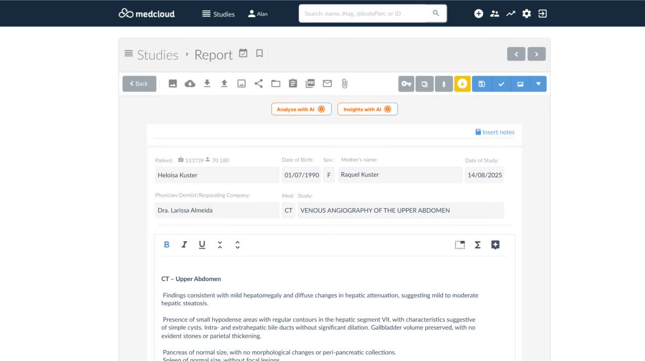 It analyzes the patient’s report history and generates a structured summary, highlighting relevant information such as diagnoses, clinical evolution, and key findings to facilitate the production of new reports.